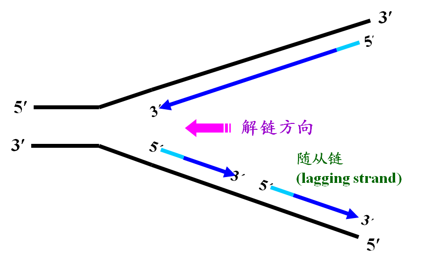 ● 另一股链因为复制的方向与解链方向相反,不能顺着解链方向连续延长,这股不连续复制的链称为随从链。