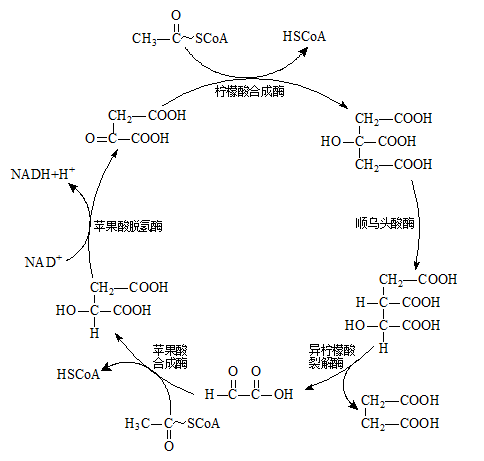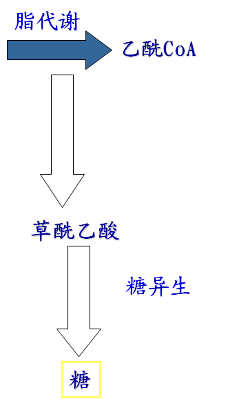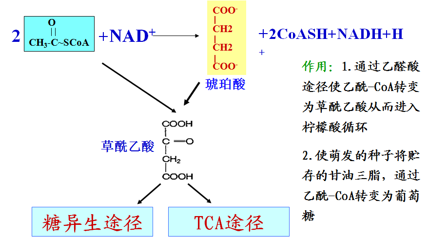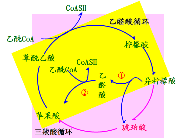 在植物和微生物体中还可通过所谓“乙醛酸循环”使乙酰CoA转变成琥珀酸,后者再经草酰乙酸步骤转变成糖或补充三羧酸循环的琥珀酸。