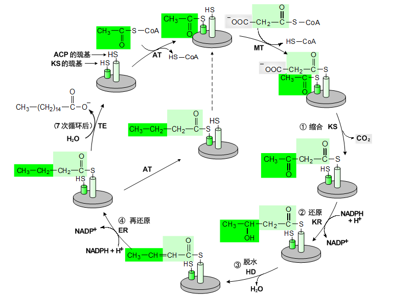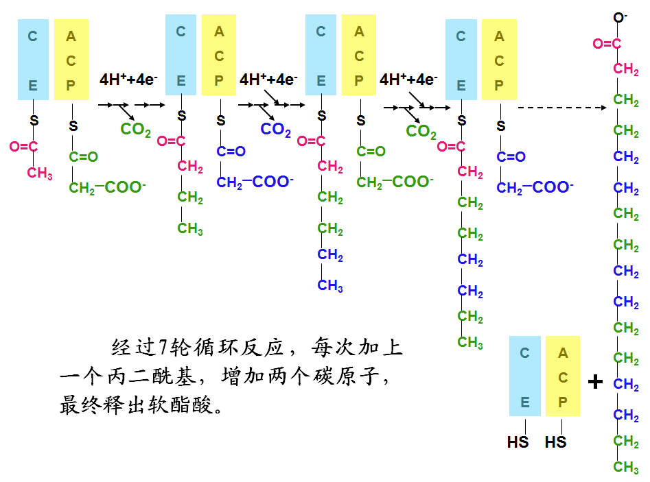 从头合成:每经历一次缩合、还原、脱水、还原的循环反应,脂肪酸延长两个碳片段。