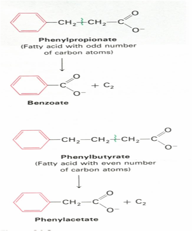 狗摄入含苯环标记的奇数碳原子脂肪酸时尿液排出马尿酸;摄入含偶数碳原子脂肪酸时尿中排除出苯乙尿酸。说明脂肪酸的分解是每次降解二碳单位的片段。