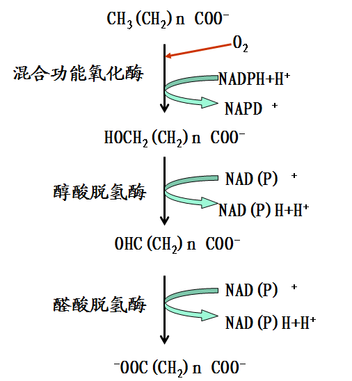 脂肪酸的ω-氧化指脂肪酸的末端甲基(ω-端)经氧化转变成羟基,继而再氧化成羧基,从而形成α,ω-二羧酸的过程。