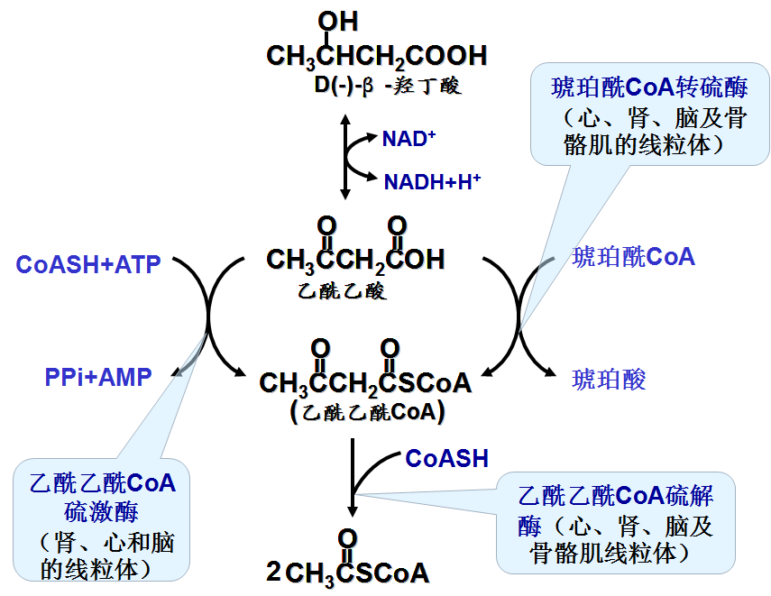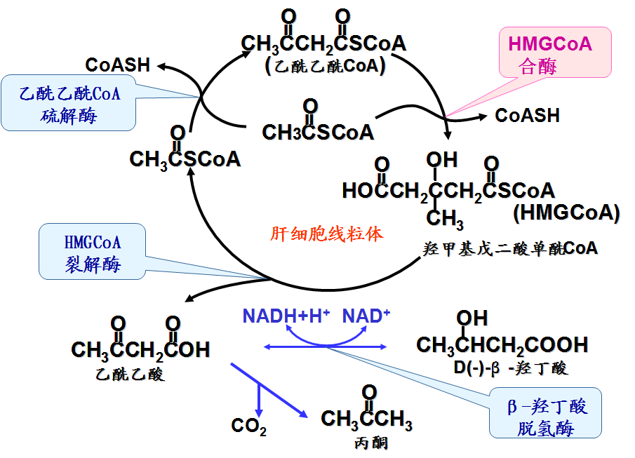 过多的脂肪摄入,长期饥饿,葡萄糖供应短缺(常见于高产乳牛,妊娠期的母畜等),导致脂肪大量动员,产生过量的乙酰CoA,可缩合成酮体。在糖尿病人,一方面糖的大量损失,另一方面由于草酰乙酸转入异生途径而使三羧酸循环不畅,糖不能有效氧化,促进乙酰CoA累积和酮体的合成。其结果是酮体在血液中的浓度增加,当超过肝外组织的利用能力时,引起酮血、酮尿等,以至酸中毒。