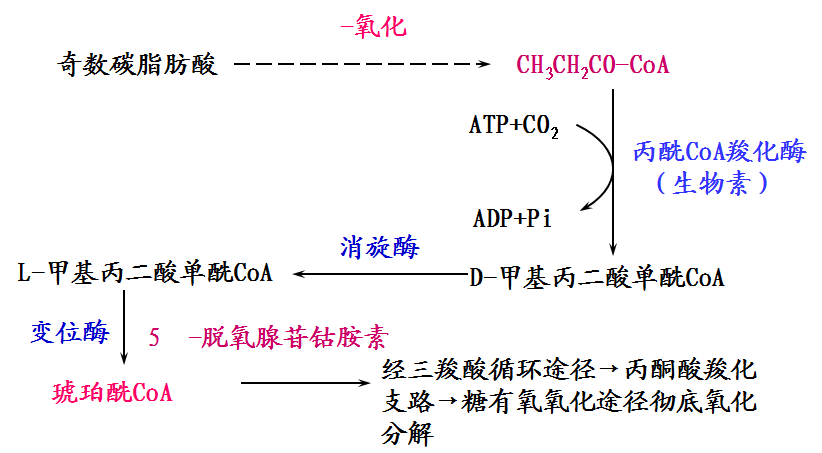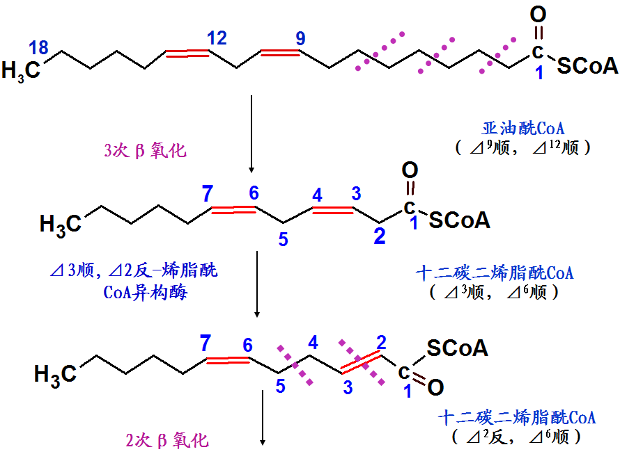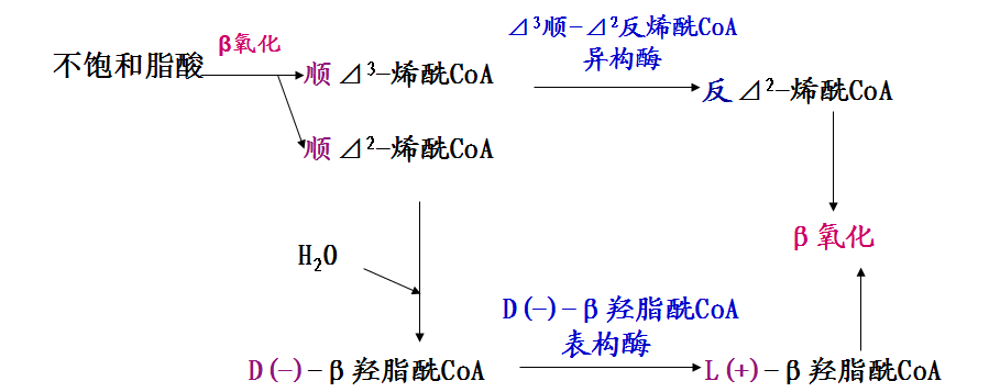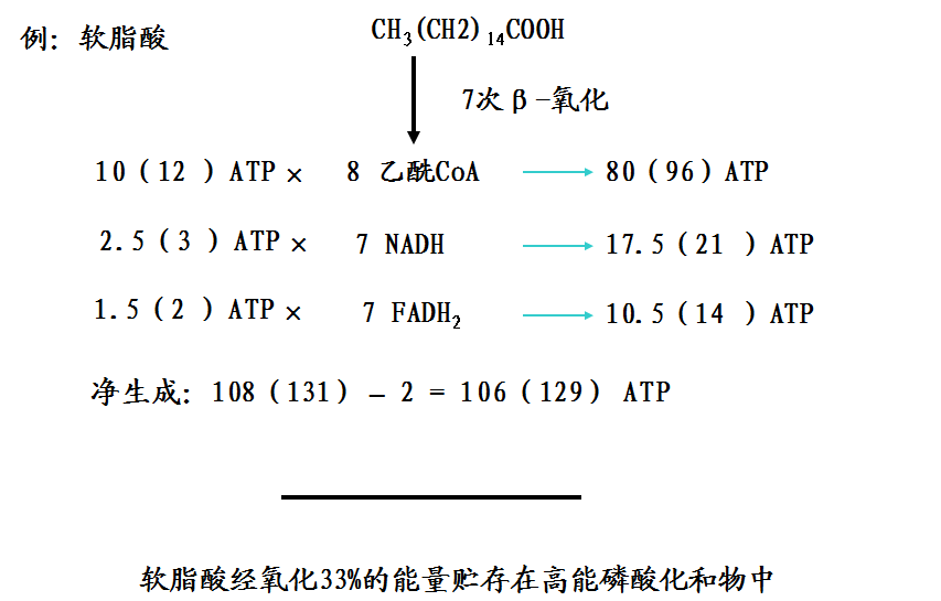 β-氧化:每经历一次脱氢、加水、脱氢、裂解的循环反应,脂肪酸减少两个碳片段,生成一分子乙酰CoA。