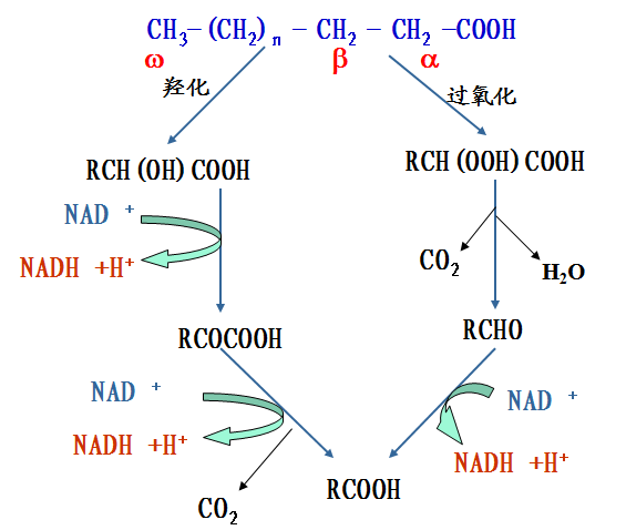 脂肪酸在一些酶的催化下,其α-C原子发生氧化,结果生成一分子CO2和较来少一个碳原子的脂肪酸,这种氧化作用称为α-氧化。