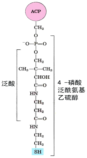 酰基载体蛋白(ACP),其辅基是4´-磷酸泛酰氨基乙硫醇, 是脂酰基载体。