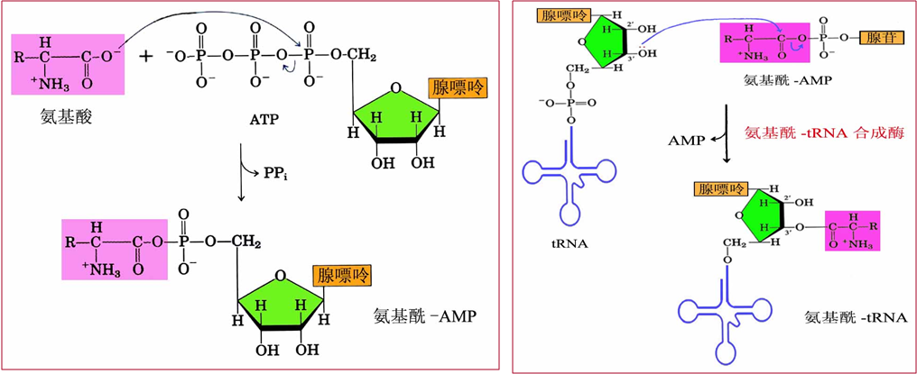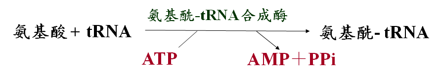 一、氨基酸的活化:氨基酸与特异tRNA形成氨酰-tRNA。