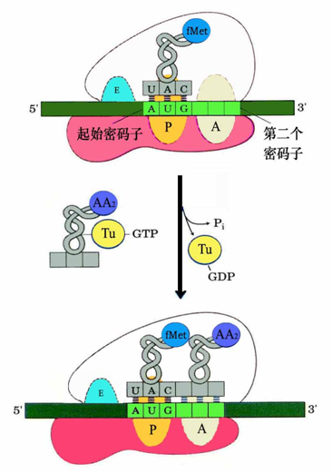 根据mRNA下一组遗传密码指导,使相应氨基酰-tRNA进入核蛋白体A位。