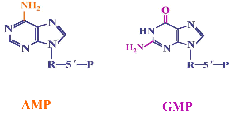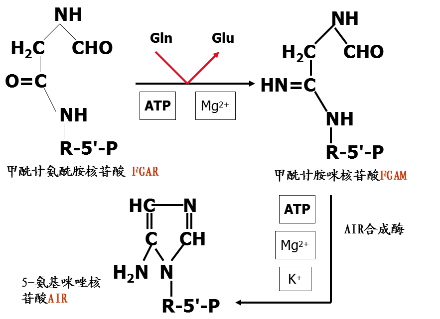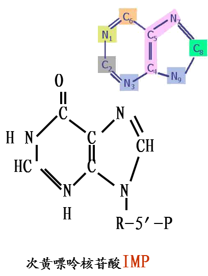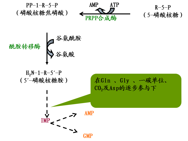 合成过程:是在5-磷酸核糖的基础上逐步合成嘌呤环,而不是首先单独合成嘌呤碱,然后再与磷酸核糖结合的;首先合成次黄嘌呤核苷酸,然后再转变成AMP,GMP