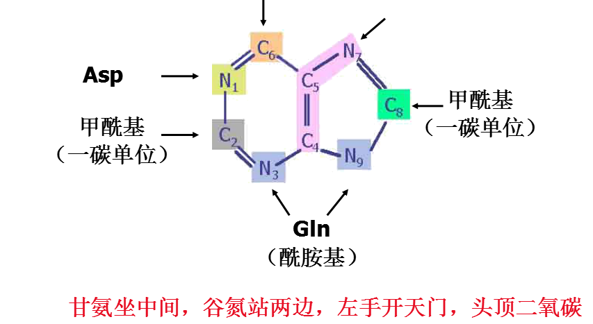 合成原料:磷酸核糖、氨基酸、一碳单位和CO2等简单物质