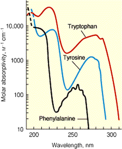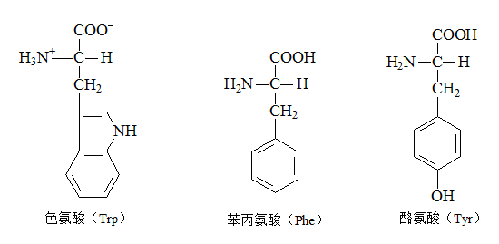 在紫外光区芳香族氨基酸在280nm处有最大吸收峰(色氨酸、酪氨酸、苯丙氨酸的最大吸收波长分别为279、278、259nm )