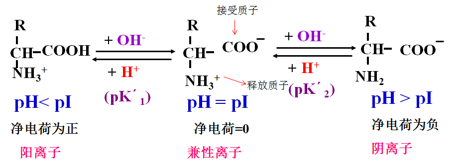 当氨基酸溶液在某一定pH值时,使某特定氨基酸分子上所带正负电荷相等,成为两性离子,在电场中既不向阳极也不向阴极移动,此时溶液的pH值即为该氨基酸的等电点(isoelctric point)。