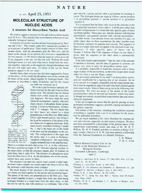 1953年James Watson 和Francis Crick描绘出了DNA的双螺旋结构模型,这在生命科学发展历史上是一个具有里程碑意义的重大事件 。