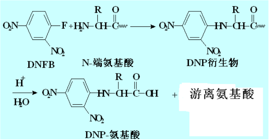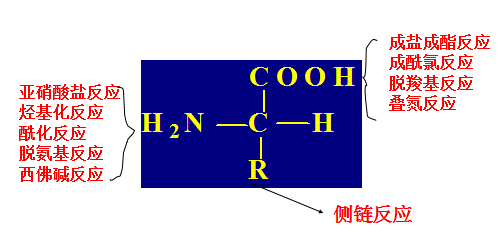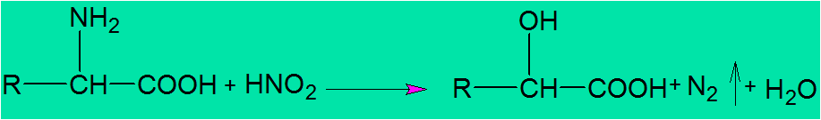 在室温下亚硝酸能与含游离α-氨基的氨基酸起反应,定量地放出氮气,氨基酸被氧化成羟酸(注:含亚氨基的脯氨酸则不能与亚硝酸反应)。