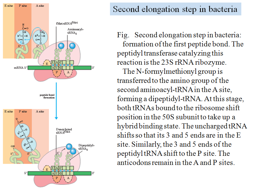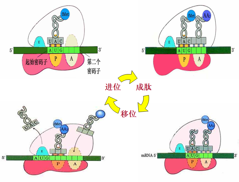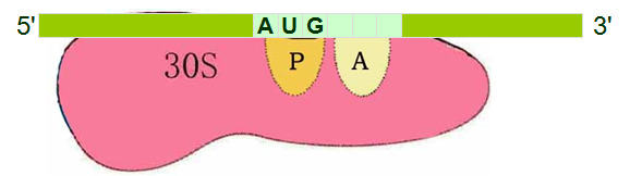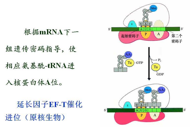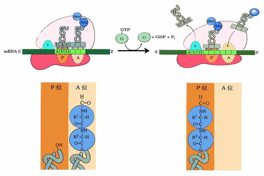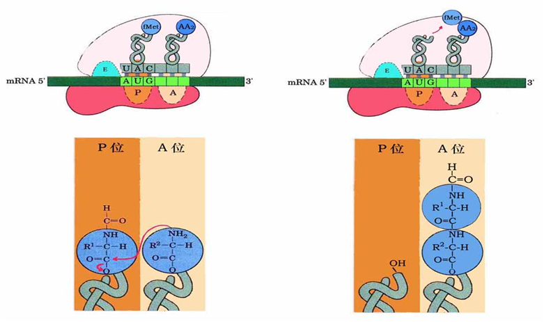 • 并将(甲酰)甲硫氨酸放入核糖体P位点。