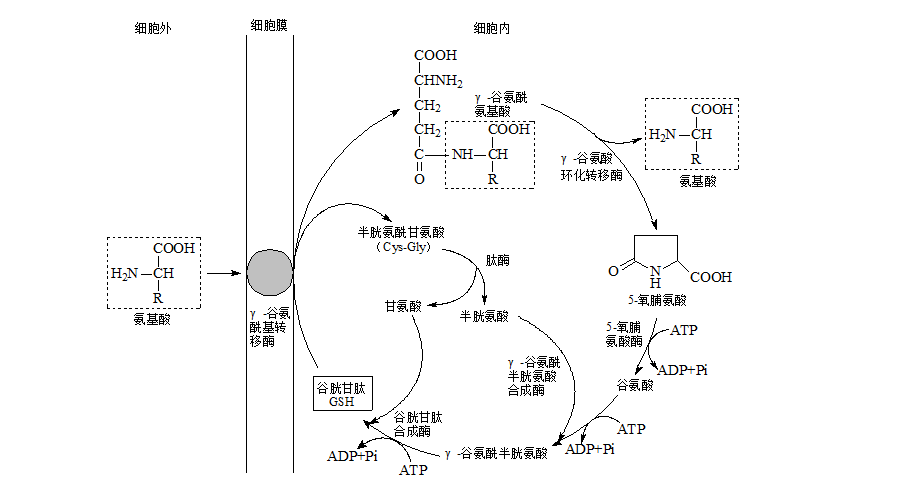 由谷氨酸,半胱氨酸和甘氨酸通过谷氨酰胺循环合成谷胱甘肽。