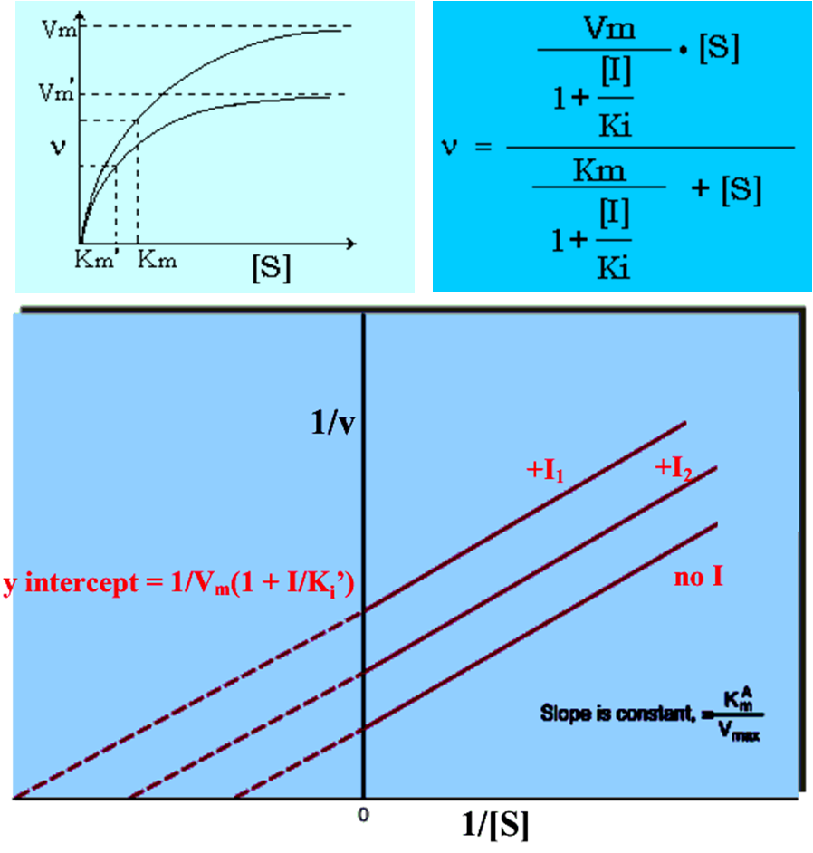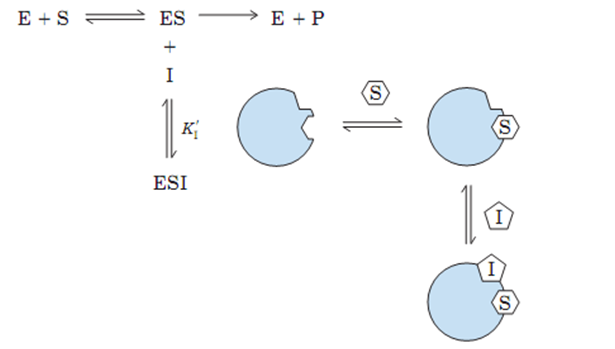 ⑵ 抑制剂与底物可同时与酶的不同部位结合;