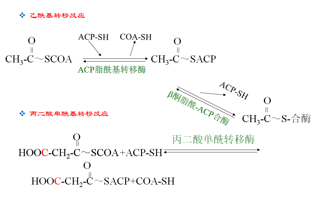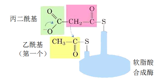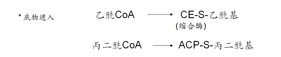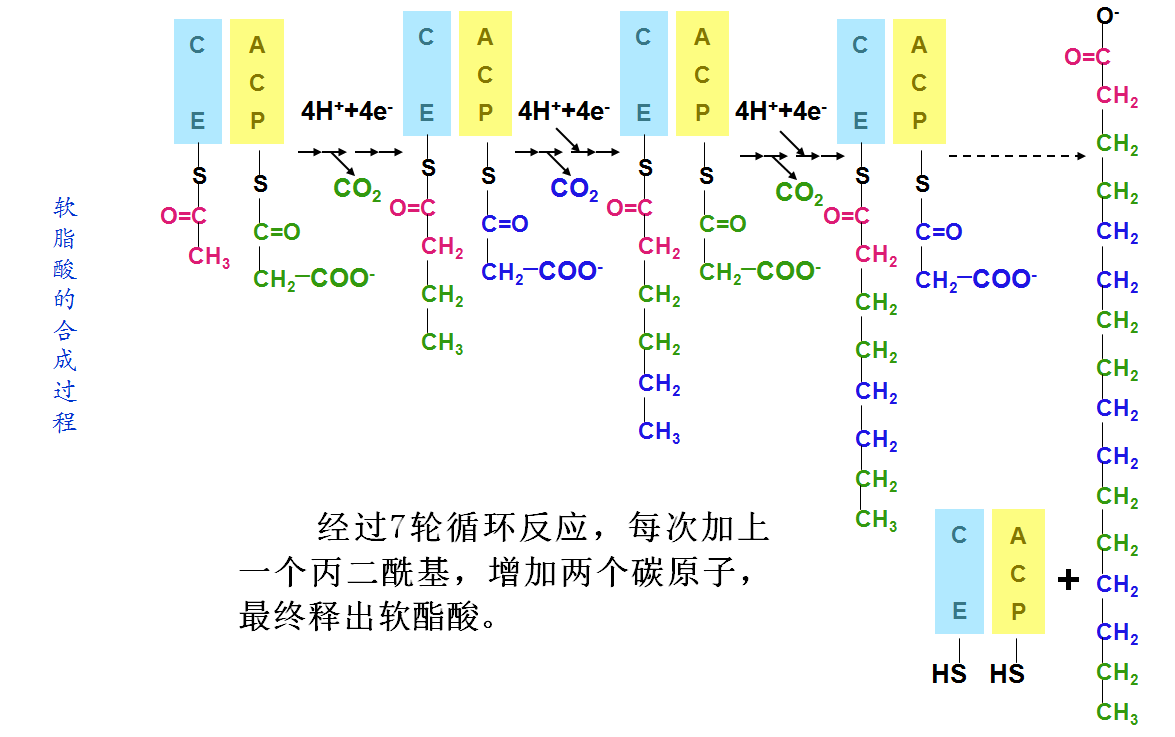 脂肪酸合成时碳链的缩合延长过程是一循环反应过程。每经过一次循环反应,延长两个碳原子。合成反应由脂肪酸合成酶系催化。