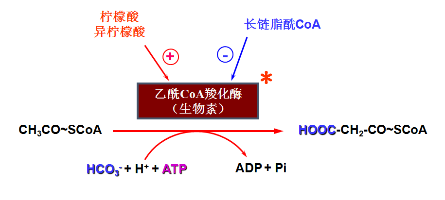 乙酰CoA羧化酶 (acetyl CoA carboxylase)是脂酸合成的限速酶,存在于胞液中,其辅基是生物素,Mn2+是其激活剂。