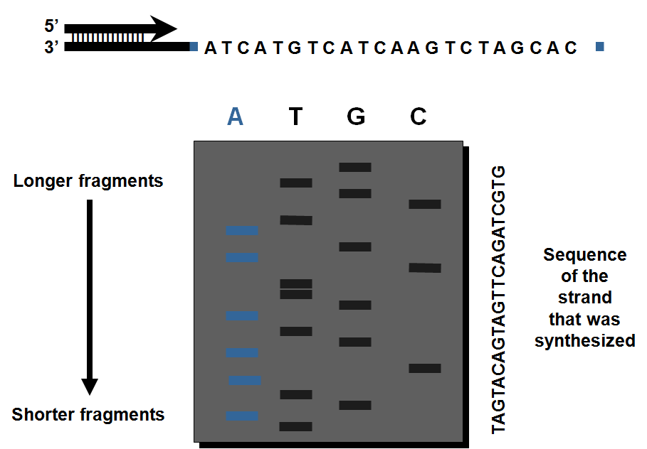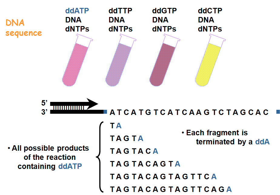 Sanger测定DNA核苷酸序列的方法:DNA合成终止法(双脱氧DNA链合成终止法)。