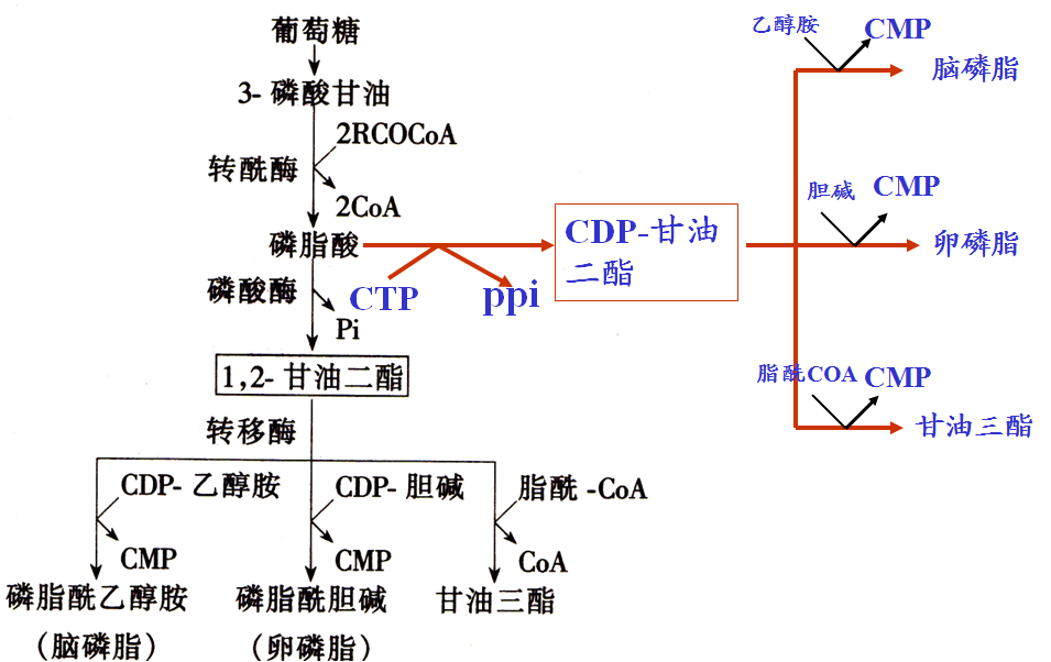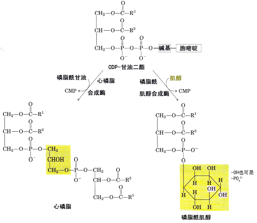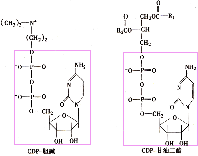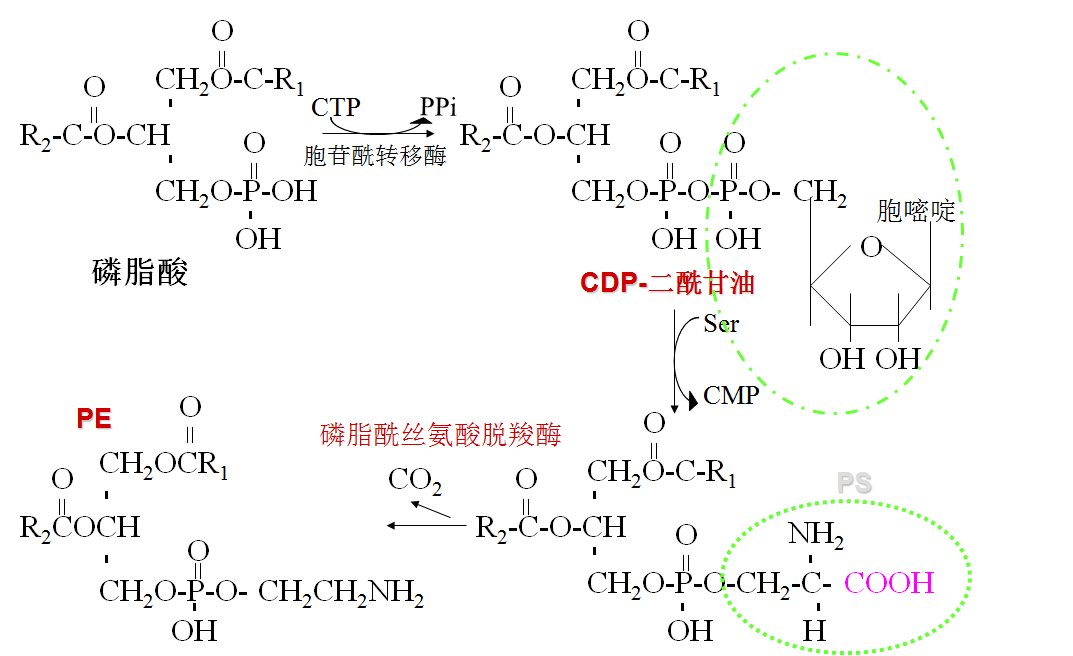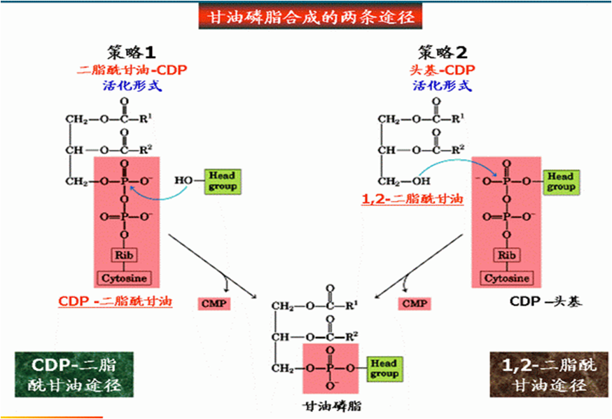 3. 以磷脂酸作前体 ,需胞嘧啶核苷酸以 CDP衍生物形 式作活化载体。