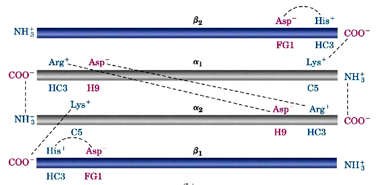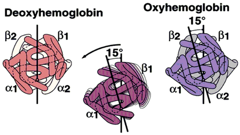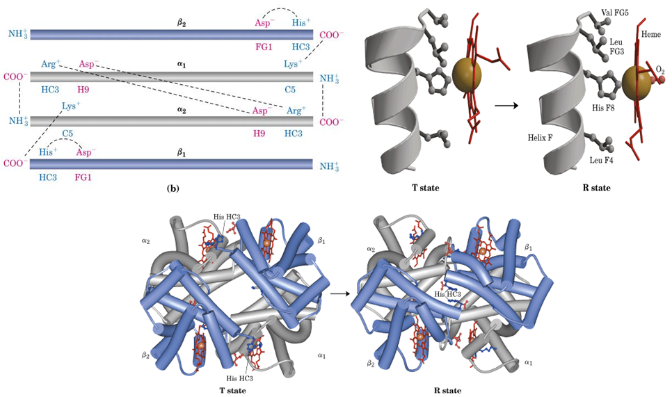 氧合可以引发维系血红蛋白4个亚基的8对离子键相继断开,从比较紧凑的T构象转变为比较松弛的R构象。
