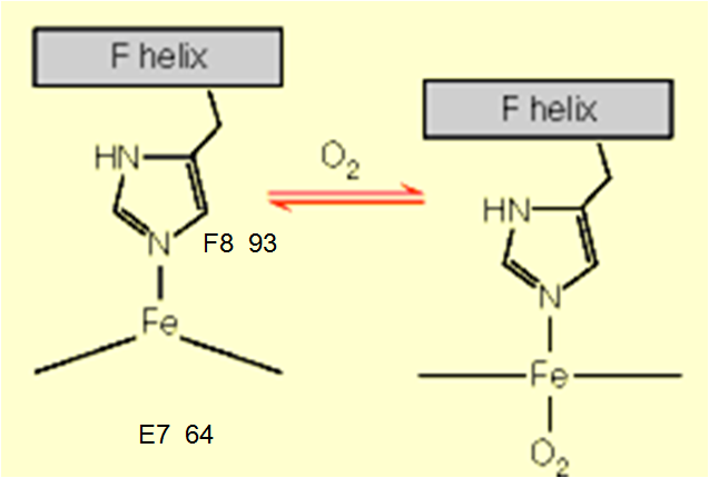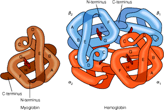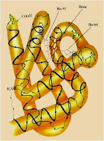 肌红蛋白是第一个被确定的具有三级结构的蛋白质,主要生物学功能是结合氧,是哺乳动物肌肉中储氧的蛋白质。肌红蛋白由一条多肽链组成,呈扁平的棱形,含有一个血红素辅基,有8段-螺旋,血红素居于分子内部的空穴中,其上的丙氨酸与蛋白质的碱性氨基酸形成盐键,Fe与F8上的组氨酸形成配位键。