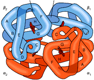 血红蛋白是脊椎动物红细胞主要组成部分,它的主要功能是运输氧和二氧化碳,维持血液pH值的稳定等作用。血红蛋白是由四个亚基构成的四级结构,呈四面体结构,每个亚基的三级结构与肌红蛋白极为相似。成人α2β2;胎儿α2γ2;早期胚胎 α2ε2。四个亚基之间被8对盐键所稳定。
