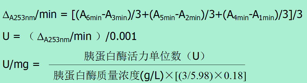 4. 计算每分钟平均A253nm增加值,即ΔA253nm/min,进而计算得出胰蛋白酶活力单位数(U)及胰蛋白酶比活力(U/mg)。