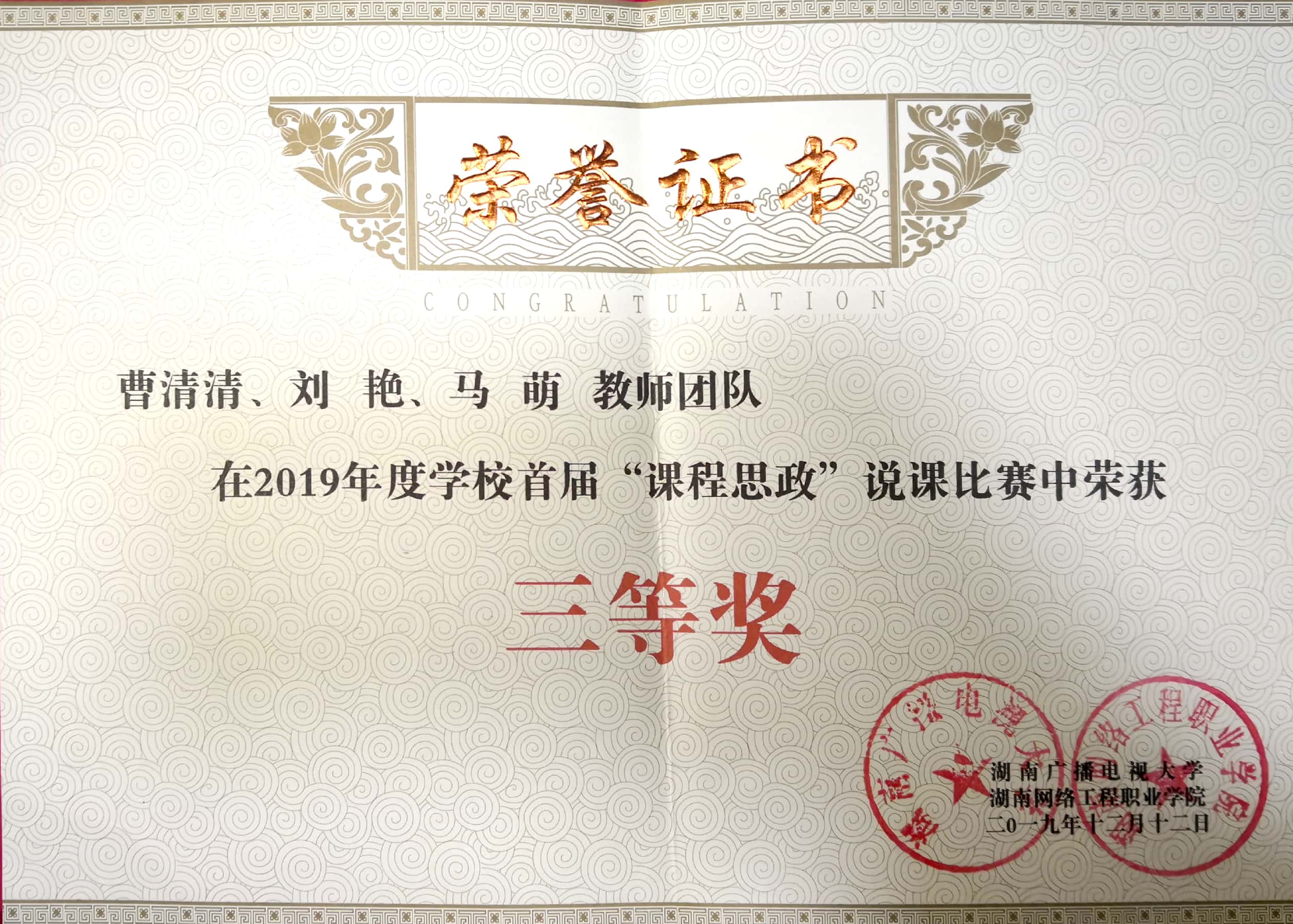 2019年学校首届课程思政说课比赛中荣获三等奖