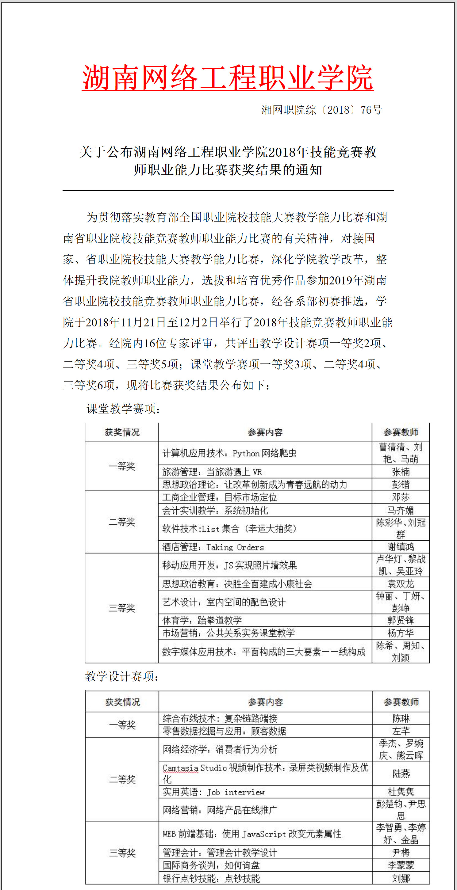2018年学校教师能力比赛荣获一等奖