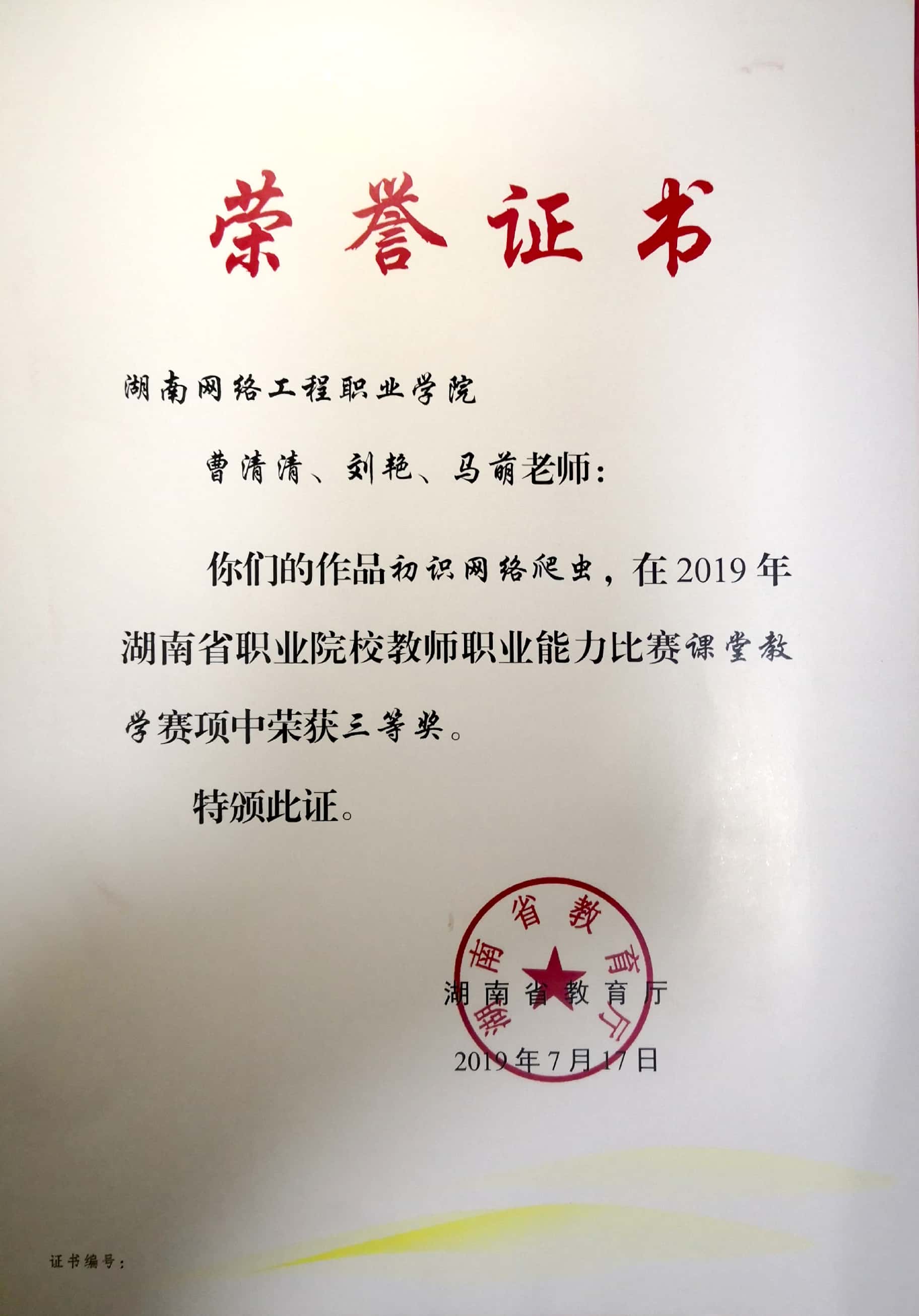 2019年湖南省职业院校教师职业能力比赛课堂教学赛项中荣获三等奖