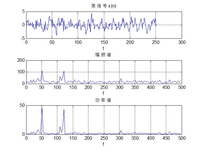 设信号为x(t)=sin(2πf1t)+sin(2πf2t)+随机噪声,f1=50Hz, f2=120Hz,以取样频率fs=1kHz对x(t)进行取样,样本长度tp=0.25s,得x(n),对x(n)作256点FFT,得频谱X(k)。