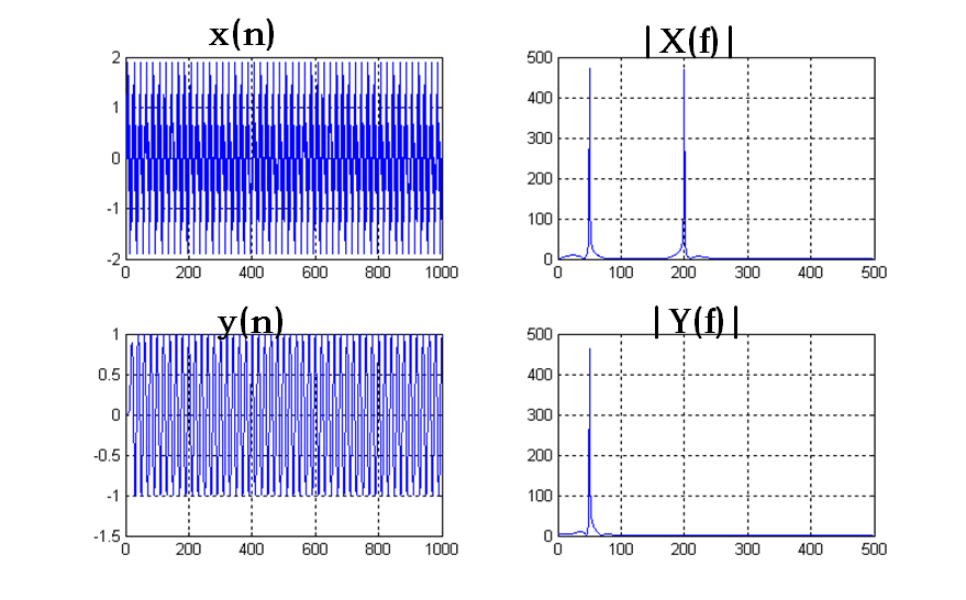 设取样频率为fs1=1000Hz,用上述低通滤波器对音频信号:x(n)=x1(n)+x2(n)=sin(2π*50/fs1*n)+ sin(2π*200/fs1*n) (n=0,1,…999)进行滤波。