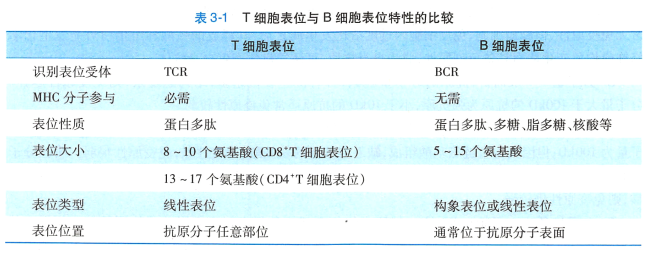 根据T、B 细胞所识别的抗原表位的不同,表位可 分为T 细胞表位和B 细胞表位。 T 细胞仅识别由 APC加工后与MHC 分子结合为复合物并提呈于APC 表面 的线性表位,此类表位称T 细胞表位。 T 细胞表位又 可分两种: (1)CD8+T 细胞识别的表位,含8 -10 个氨基酸,其中第2 、9 位氨基酸为铀定氨基酸(anchor residue) ; (2)CD4 +T 细胞识别的表位,较长,含1 3 -17 个 氨基酸。 BCR 或抗体识别的B 细胞表位,无需APC 加工和提呈,含5 -15 个氨基酸,多为构象表位, 少数为线性表位,位于抗原分子表面。 表3-1 是T 细 胞表位和B 细胞表位特性的比较。