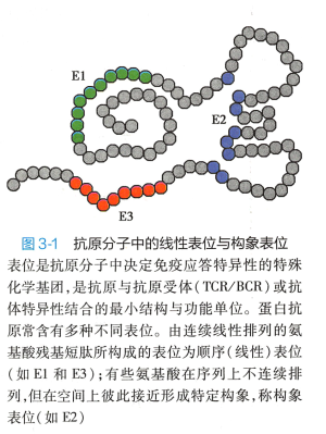 2. 抗原表位的类别 根据抗原表位中氨基酸的 空间结构特点,可将其分为顺序表位(sequential epitope) 和构象表位(conformational epitope) (图 3 -1) 。 顺序表位由连续线性排列的氨基酸构成,又称 线性表位(linear epitope) ; 而构象表位由不连续排 列、但在空间上彼此接近形成特定构象的若干氨基 酸组成。