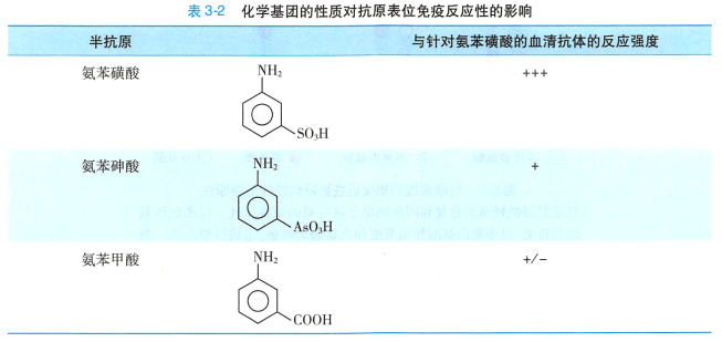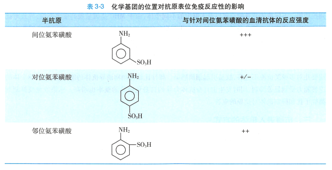 5. 分子构象 (conformation) 抗原表位的空间构象很大程度上影响了抗原的免疫原性。 某 些抗原分子在天然状态下可诱生特异性抗体,但一经变性,由于所含构象表位的改变,可失去诱生抗 体的能力。 抗原大分子中所含抗原表位的性质、数目、位置和空间构象均可影响抗原的免疫原性或免 疫反应性。 例如,氨苯磺酸氨苯碑酸和氨苯甲酸在结构上相似,仅一个有机酸基团有差异,均可诱生 特异性抗体;但抗氨苯磺酸抗体仅与氨苯磺酸高度结合,对相似的氨苯珅酸和氨苯甲酸只起中等和弱反应(表3-2) , 表明化学基团性质可影响抗原表位的免疫反应性(动画3-4"化学基团的性质对抗原免 疫反应性的影响")。 即使均为氨苯磺酸,但抗间位氨苯磺酸抗体只对间位氨苯磺酸产生强反应,对 邻位氨苯磺酸和对位氨苯磺酸仅呈弱或无反应,提示化学基团的位置也影响抗原表位的免疫原性与 免疫反应性(表3-3 ) 。 抗右旋、 抗左旋和抗消旋酒石酸的抗体仅对相应旋光性的酒石酸起反应,即空 间构象也显著影响抗原表位的免疫原性与免疫反应性。