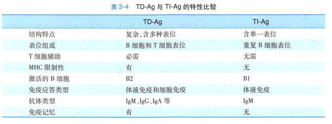1. 胸腺依赖性抗原 (thymus dependent antigen, TD-Ag) 绝大多数蛋白质抗原如病原微生物、大分子化合物、血清蛋白等刺激B 细胞产生抗体时,必须依赖T 细胞的辅助,称TD-Ag, 又称T 细胞依赖性抗原。 先天性胸腺缺陷和后天性T 细胞功能缺陷的个体,TD-Ag 诱导机体产生抗体的能 力明显低下。