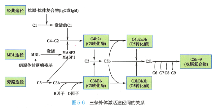 C3b 可与C3bBb 复合物结合为C3bBb3b,此即旁路途径C5 转化酶。 其后的末端通路与经典途径 完全相同。