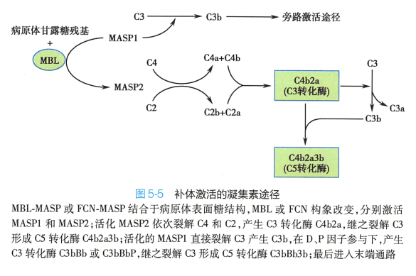 凝集素途径( lectin pathway) 又称 MBL 途径(MBL pathway) , 指血浆中甘露糖结合凝集素(mannose-binding lectin, MBL) 、纤维胶原素(ficolin , FCN) 等直接识别病原体表面糖结构,依次活化 MBL 相关丝氨酸蛋白酶(MEL-associated serine protease, MASP) 、 C4、 C2、 C3,形成与经典途径中相同的 C3 转化酶与C5转化酶的级联酶促反应过程。