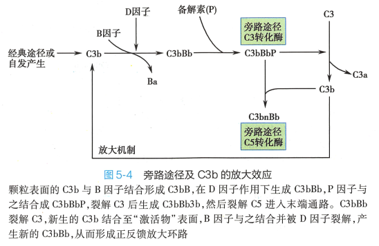 旁路途径中,备解素(P) 可结合细菌表面,稳定C3b 与 Bb 结合形成C3 转化酶,防止其被降解。结合于激活物表面的C3bBb 可裂解更多C3 分子,新生的C3b 又可与Bb 结合为新的C3bBb,形成旁 路激活的正反馈放大效应(图5-4) 。