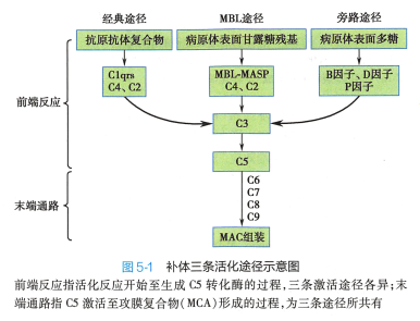 补体固有成分以非活化形式存在千体液中,通过级联酶促反应被激活,产生具有生物学活性的产 物。 已发现三条补体激活途径,它们有共同的终末反应过程(图5-1 ) 。