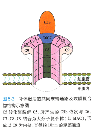 C5 转化酶(C4b2a3b)将C5 裂解为C5a、C5b;C5a 游离于液相,是重要的炎症介质,C5b 可与C6 稳定结合为C5b6;C5b6 自发与C7 结合成C5b67,暴露膜结合位点,与附近的细胞膜非特异性结合;结合于膜上的C5b67 可与C8 结合,所形成的C5b678 可促进与多个C9 分子聚合,形成C5b6789n 复合 物,此即攻膜复合物(membrane attack complex, MAC) (图 5-3) 。 插入细胞膜的MAC 通过破坏局部磷 脂双层而形成"渗漏斑",或形成穿膜的亲水性孔道,可容许水、离子及可溶性小分子等经此孔道自由 流动。 由于胞内胶体渗透压较胞外高,故大量水分内流,导致胞内渗透压降低、细胞逐渐肿胀并最终 破裂(溶破)。