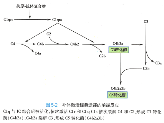 经典途径(classical pathway) 指激活物与C1q 结合,顺序活化C1r、 Cls、 C4、 C2、 C3,形成C3 转化酶(C4b2a) 与C5 转化酶(C4b2a3b) 的级联酶促反应过程(图5-2) 。 C1 通常以C1q(C1r)2(C1s)2 复合 大分子形式存在于血浆中。 C2 血浆浓度很低,是补体活化级联酶促反应的限速成分。 C3 是血浆中 浓度最高的补体成分,是三条补体激活途径的共同组分。