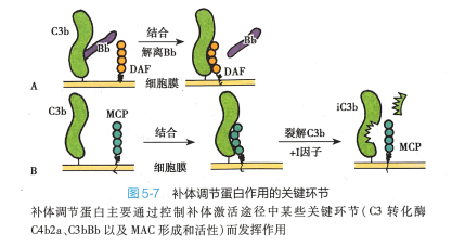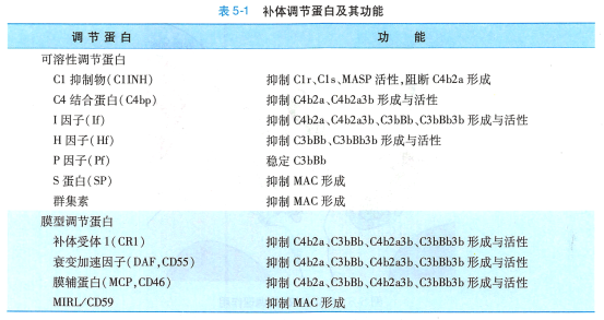 机体对补体系统活化存在着精细的调控机制,主要包括: 1)控制补体活化的启动;2)补体活性片 段发生自发性衰变;3)血浆和细胞膜表面存在多种补体调节蛋白,通过控制级联酶促反应过程中酶活 性和MAC 组装等关键步骤而发挥调节作用(图5-7 ) 。 各类补体调节蛋白针对补体激活途径关键环节 的调节机制如表5-1 。