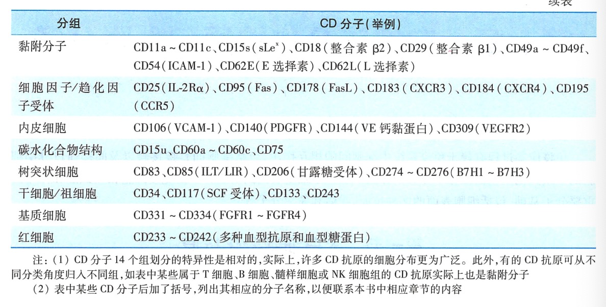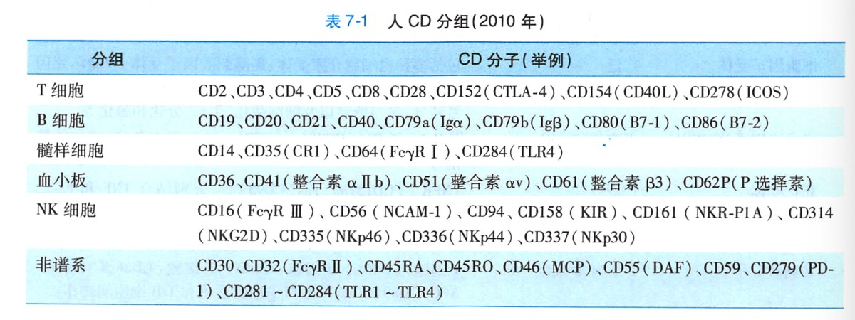 1975年创立的B淋巴细胞杂交瘤和单克隆抗体技术,极大地推动了白细胞分化抗原的研究。国际专门命名机构以单克隆抗体鉴定为主要方法,将来自不同实验室的单克隆抗体所识别的同一种分化抗原归为同一个分化群(cluster of differentiation.CD)。在许多情况下,单克隆抗体及其识别的相应抗原都用同一个CD编号。经第九届国际人类白细胞分化抗原专题讨论会命名,目前人CD的编号已命名至 CD363,可大致划分为 14 个组(表 7-1)。