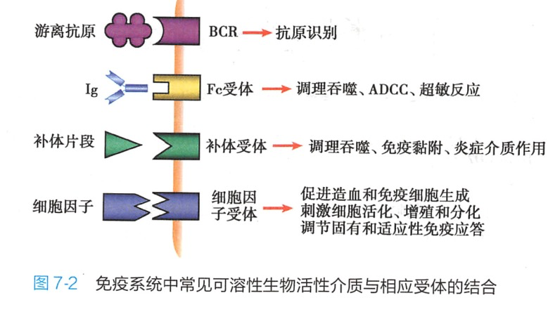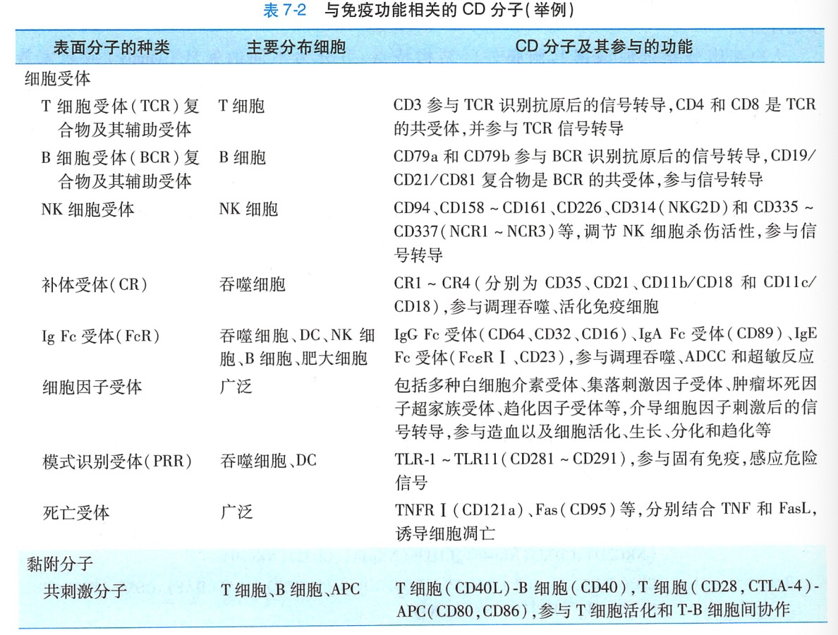有关人白细胞分化抗原的主要功能如表 7-2、图 7-1 和图 7-2。人白细胞分化抗原按其执行的功能主要分为受体和黏附分子.其中受体包括特异性识别抗原的受体及其共受体、模式识别受体、细胞因子受体、补体受体、NK细胞受体以及Ig Fc 受体等。黏附分子包括共刺激(或抑制)分子、归巢受体和血管地址素(vascular addressin)等。有关T细胞受体(TCR)、B细胞受体(BCR)、NK细胞受体、模式识别受(pattern recognition receptor PRR)、补体受体和细胞因子受体等内容在本书相关章节中作重点介绍。