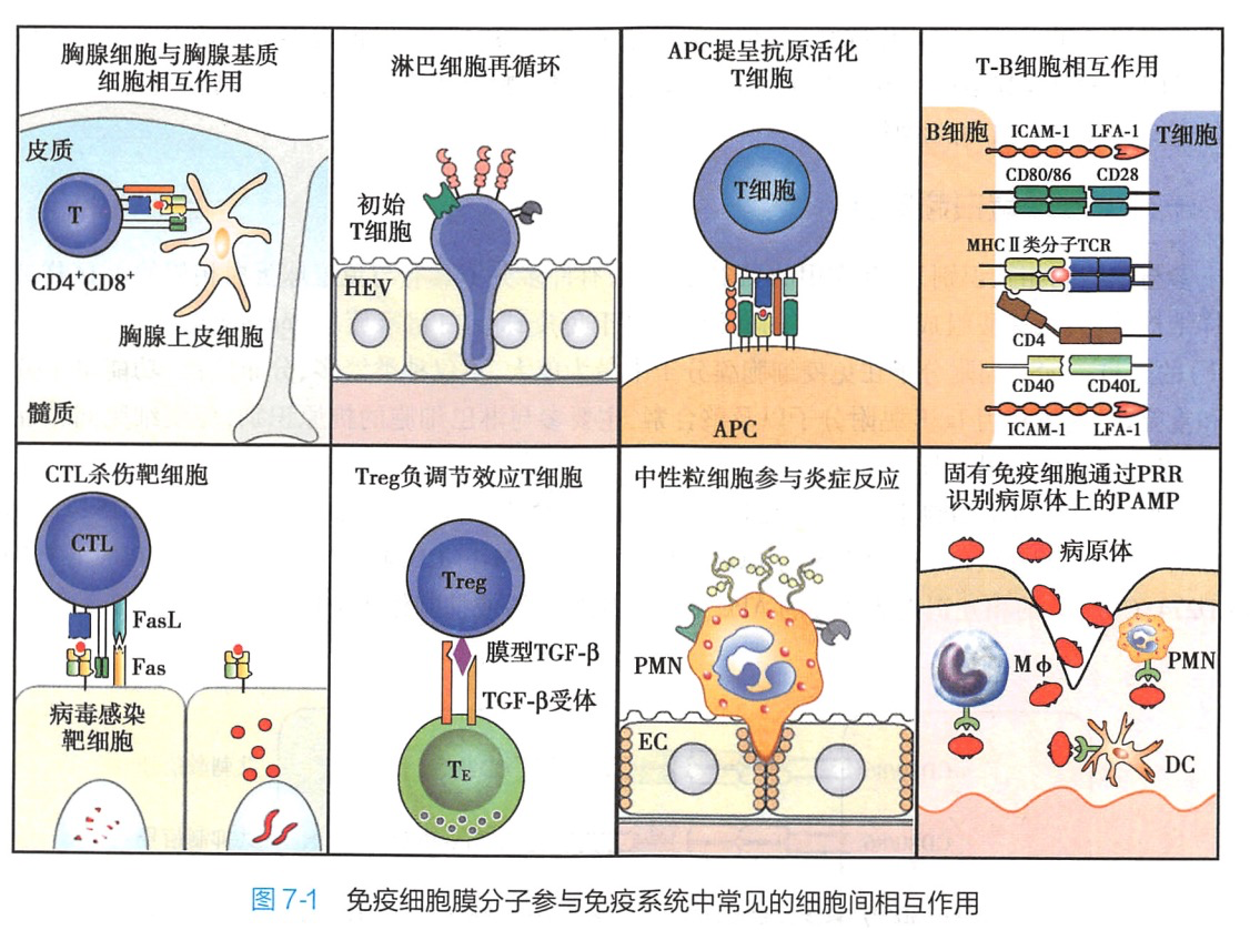 免疫应答过程有赖于免疫系统中细胞间的相互作用,包括细胞间直接接触以及间接通过分泌细胞因子或其他生物活性分子介导的作用。表达于细胞表面的功能分子是免疫细胞相互识别和作用的重要分子基础,包括细胞表面的多种抗原、受体和黏附分子等。