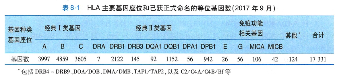 HLA基因复合体是人体多态性最丰富的基因系统。截至2017年9月,已确定的 HLA 等位基因总数达到 17 331 个,其中等位基因数量最多的座位是 HLA-B(4859 个)。这表明,非亲缘关系个体间存在两个相同等位基因的概率会很低,因而,进行组织和器官移植时移植物会受到免疫排斥。表8-1提供了 HLA 主要座位的等位基因数。