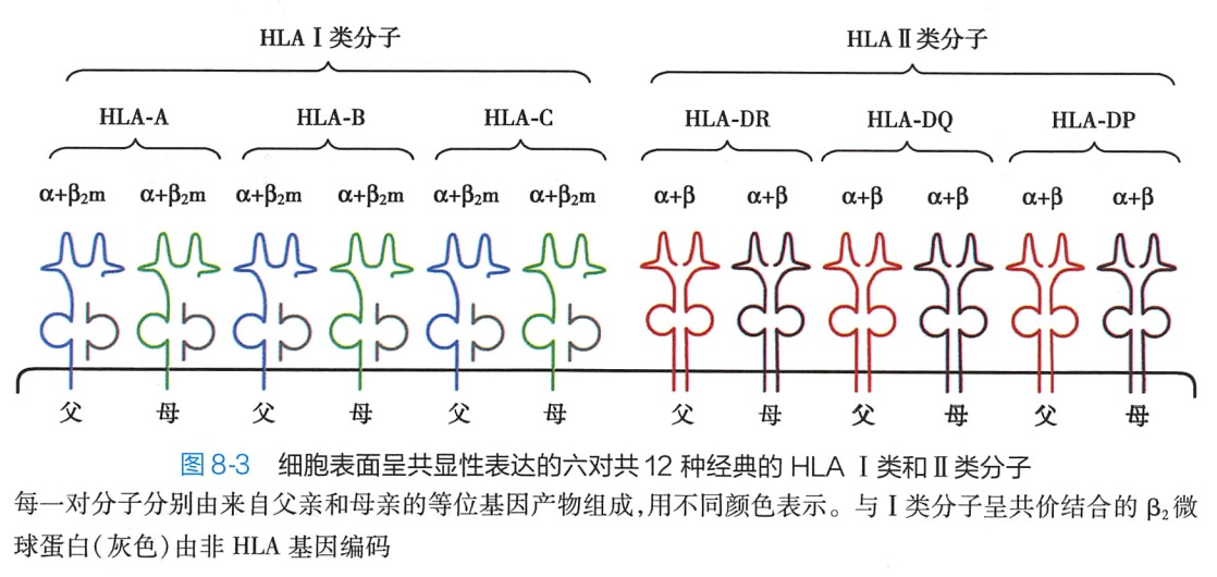 多态性(polymorphism)指群体中单个基因座位存在两个以上不同等位基因的现象。HLA I和Ⅱ类等位基因产物的表达具有共显性特点,即同一个体中,一个基因座位上来自同源染色体的两个等位基因皆能得到表达,因而一个个体通常拥有的经典I类和Ⅱ类 HLA 等位基因产物有 12 种以上(图8-3)。