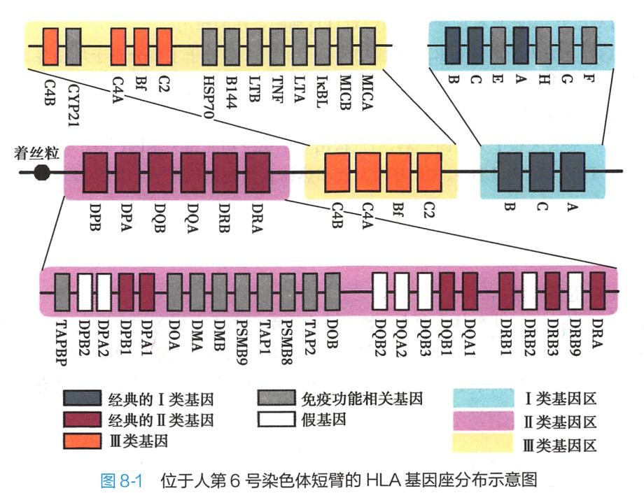 5. TAP 相关蛋白基因 其产物称 tapasin,即 TAP 相关蛋白(TAP-associated protein)。上述免疫功能相关基因全部位于 HLA 系统的Ⅱ类基因区(见图 8-1)。